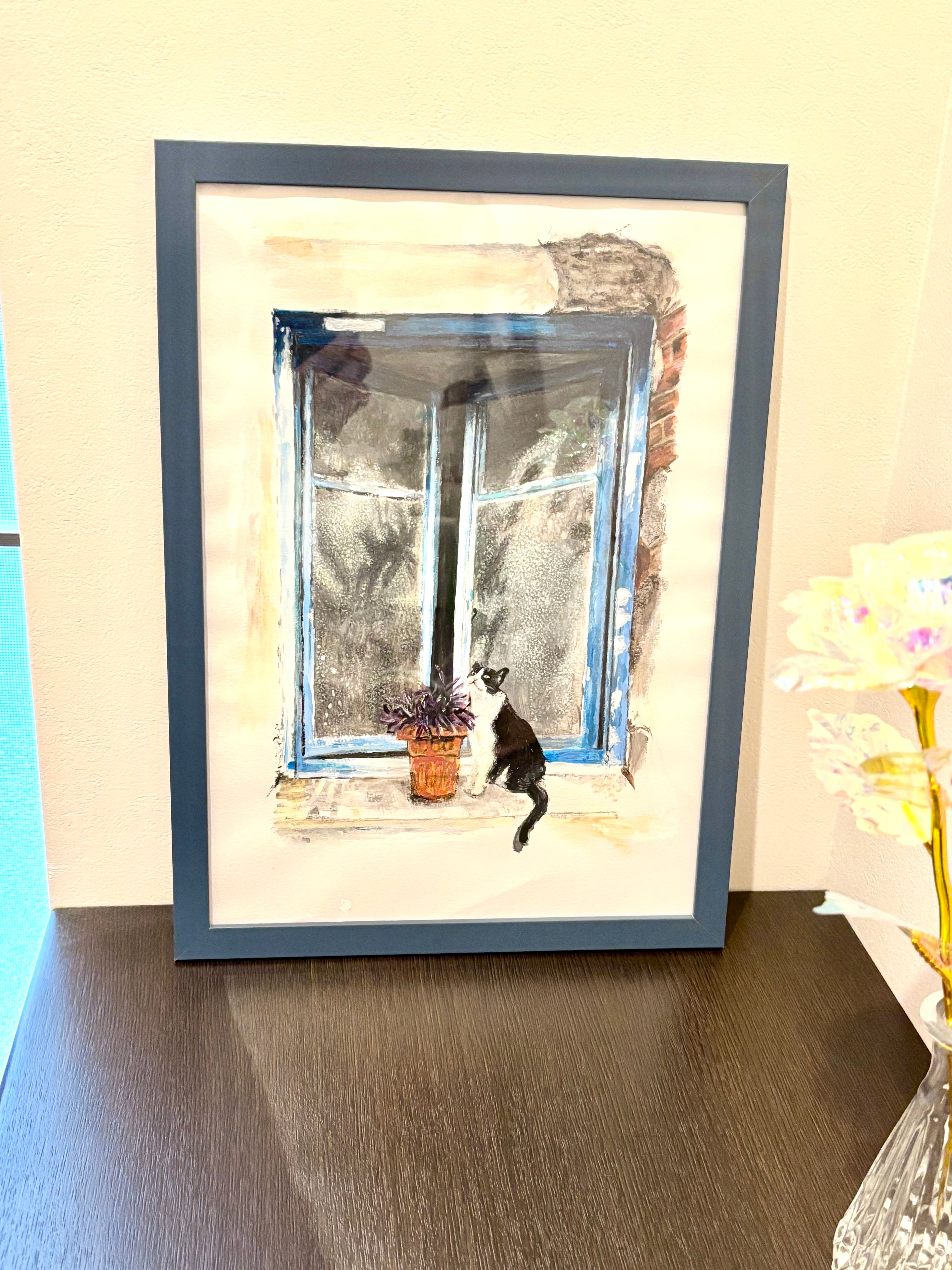 柔らかいブルーの窓枠と、猫の静かな佇まいが印象的。